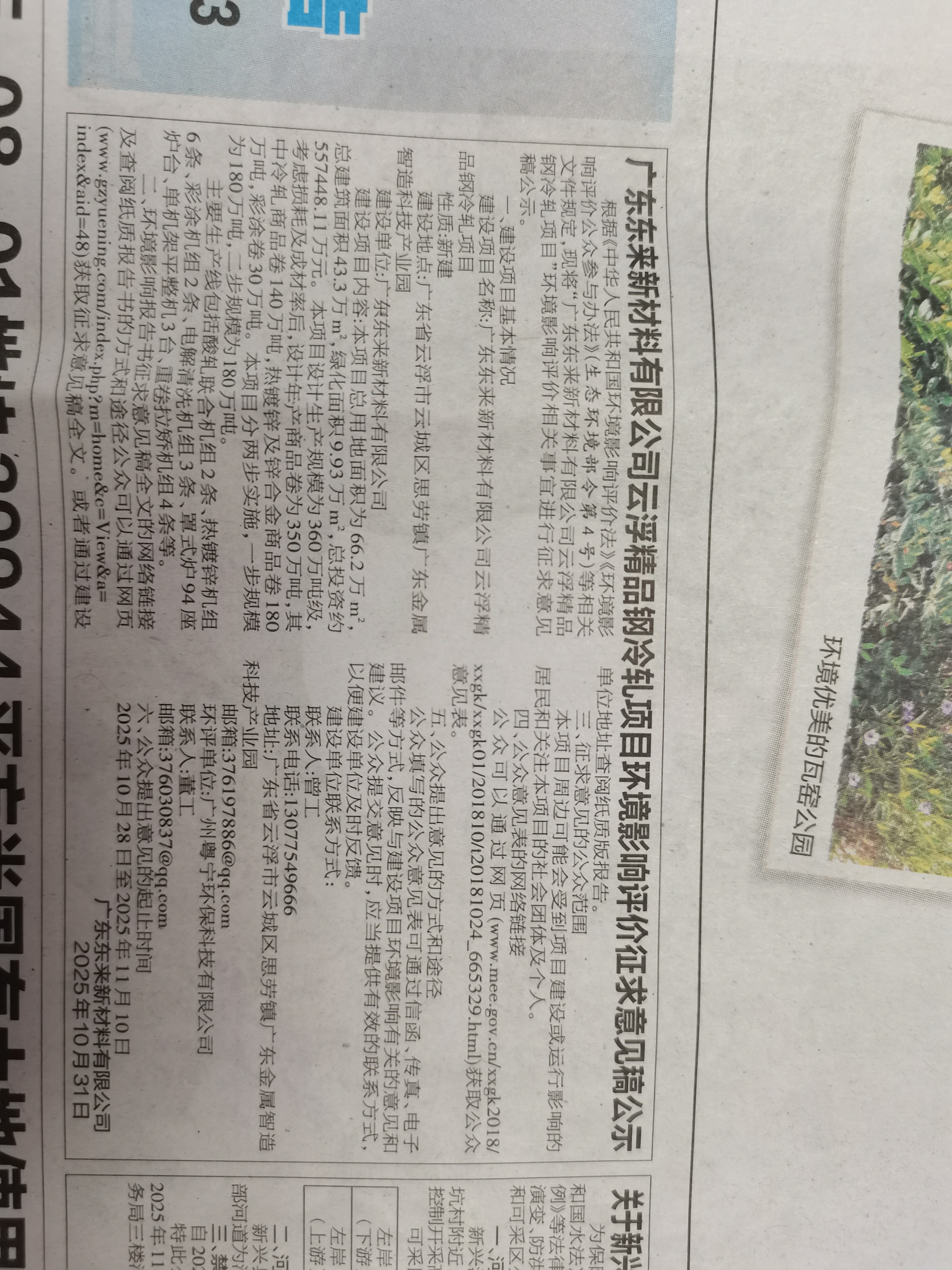 广东东来新材料有限公司云浮精品钢冷轧项目 环境影响评价征求意见稿公示